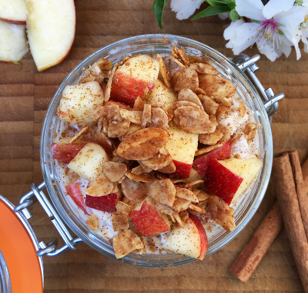 Det er så utrolig enkelt, du blander bare alle ingrediensene i en bolle før du legger deg, setter den i kjøleskapet – og voilà! Morgenen etter kan du nyte en god OG sunn frokost uten stress. Det er heller ikke noe minus at barna elsker den, og man kan veksle mellom hundrevis av varianter. Flere vil bli servert hos EVA i PROVENCE om ikke lenge, så fortsett å titte innom… Men først på menyen er denne friske varianten med eple og kanel, toppet med ristede mandler.