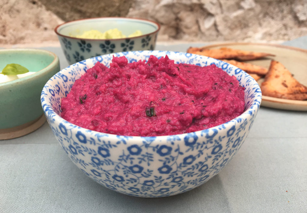 Hummus består hovedsakelig av kikerter og olivenolje, men i denne varianten er det også tilsatt rødbet. Dette gir hummusen en mer søtlig smak, samtidig som den gjør den litt “saftigere” – om man kan si det om en dipp. Og med den sterke rødfargen så gjør den seg også godt på bordet.